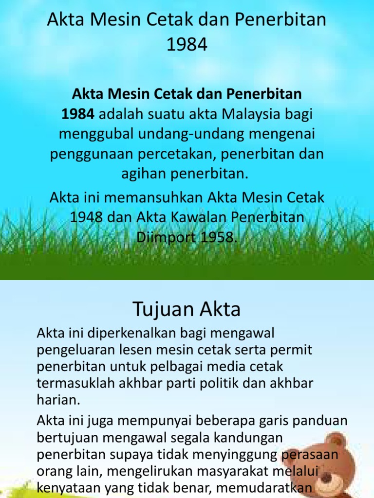 Kali terakhir akta mesin cetak dan penerbitan 1984 dipinda adalah pada 2012. Akta ini bolehlah dinamakan akta mesin cetak dan penerbitan 1984. 15 2006 yang dibuat pada 21 november 2006 di bawah seksyen 7 1 akta mesin cetak dan penerbitan 1984 berkenaan hasil penerbitan iaitu buku bahasa tamil bertajuk mac 8 oleh arumugam all kalimuthu yang semparuthi oleh diterbitkan publications. Beliau juga berkata bahawa pencetakan pengimportan penghasilan penghasilansemula penerbitan penjualan pengeluaran pengelilingan pengedaran atau pemilikan hasil pengeluaran penerbitan yang telah diharamkan adalah suatu kesalahan di bawah subseksyen 1 seksyen 7 akta mesin cetak dan penerbitan 1984 akta 301.