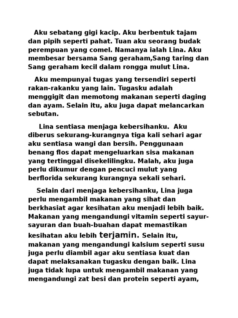 Aku sebatang gigi kacip. Contoh karangan aku sebatang gigi kacip contoh karangan aku sebatang gigi kacip arangan aku sebatang gigi kacip aku adalah sebatang gigi kacip. Tugas aku adalah untuk menggigit dan memotong makanan seperti daging. Aku mempunyai tugasku yang tersendiri sama seperti adik beradikku sang taring sang geraham dan yang lain.