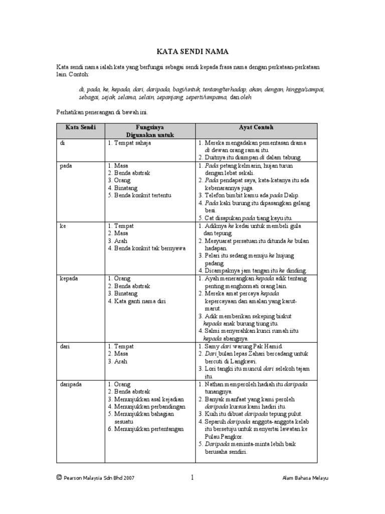 Abdul aziz babkr. Kata sendi nama ialah kata yang digunakan untuk menyambung frasa nama dengan kata atau frasa frasa dan ayat. 252 kata sendi nama ialah perkataan yang letaknya di hadapan frasa nama. Digunakan di hadapan kata nama sebagai penerang perlakuan yang dikenakan ke atas.