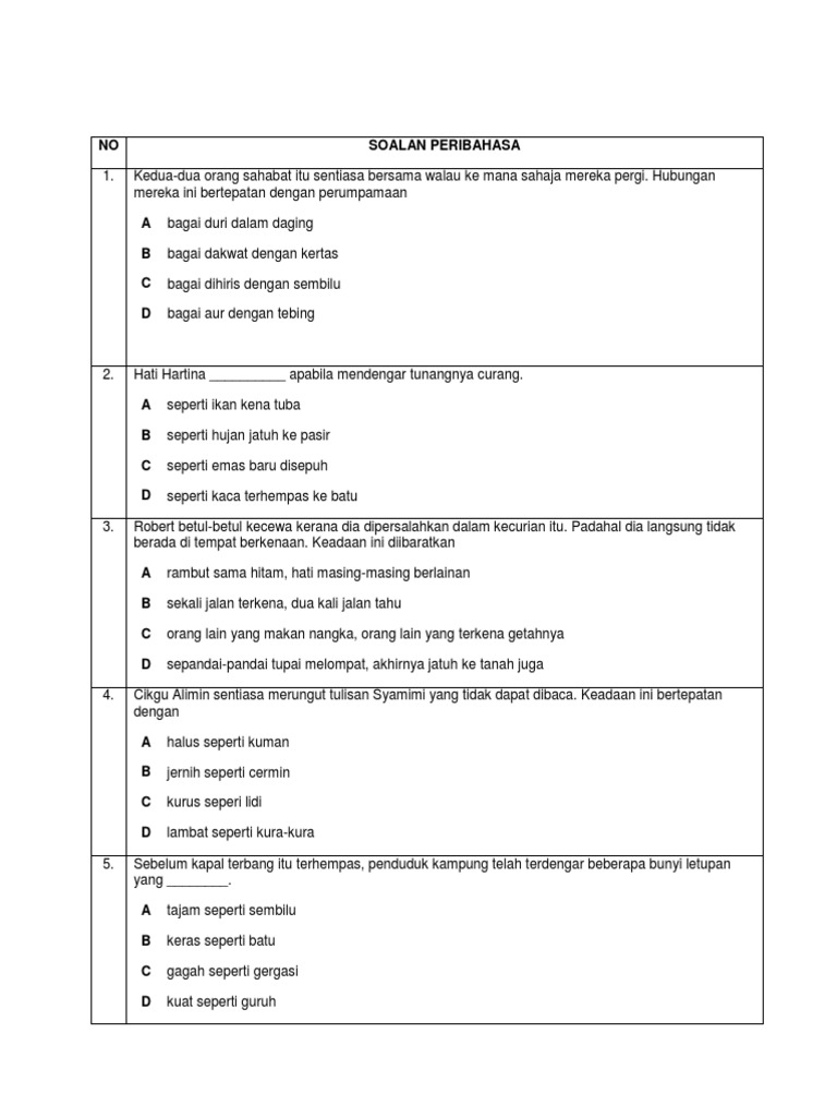 Bagai duri dalam daging. Seperti embun di hujung rumput. Datang seperti ribut pergi seperti semut. Berat sama dipikul ringan sama dijinjing 6.