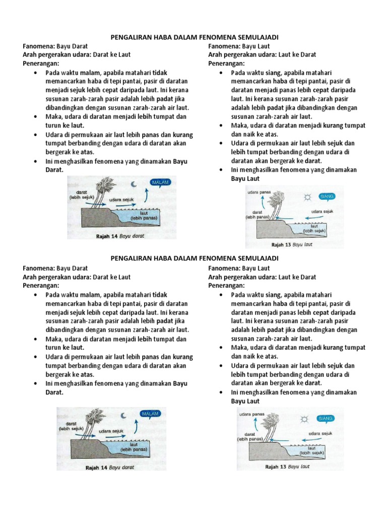 Bayu laut dan bayu darat. Udara di atas permukaan darat dipanaskan dan menjadi kurang tumpat seterusnya bergerak ke atas. Perbezaan suhu ini akan mewujudkan kecerunan tekanan yang menjadi daya penggerak untuk bayu merentasi garis pantai dengan membentuk pola harian yang tersendiri. Berlaku pada waktu siang bertiup dari laut ke darat laut kehilangan haba dengan cepat menjadi sejuk tekanan udara tinggi daratan menjadi panas lebih cepat berbanding laut tekanan udara rendah. Bayu darat terjadi pada tengah malam dan awal pagi br br bayu laut terjadi ketika pada pagi hingga menjelang tengahari daratan menyerap tenaga panas lebih cepat dari lautan sehingga suhu udara di darat lebih panas daripada di laut.