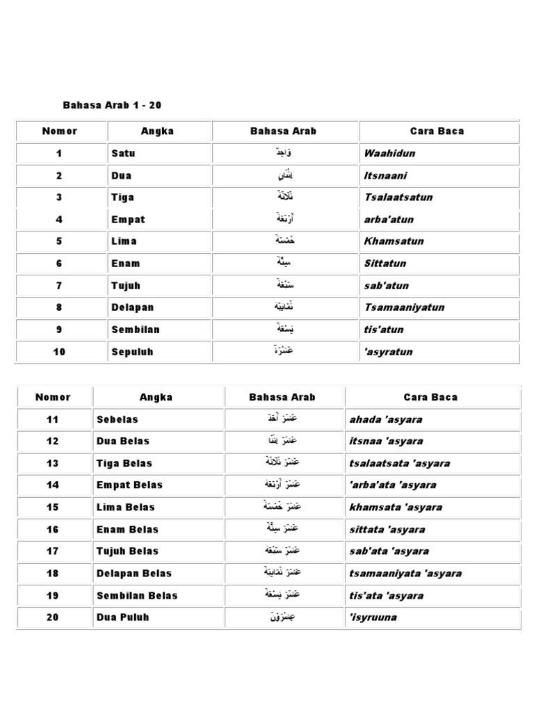 Bahasa arab angka bilangan 1 20 admin januari 25 2020 februari 1 2020 leave a comment pada kesempatan kali ini kita akan belajar tentang bahasa arab angka atau bilangan 1 20 baik mudzakkar dan muannats serta aturan penggunaannya. Jika anda sudah mahir dalam menghafalkan bahasa arab angka dari 1 20 kemudian anda bisa mulai menambahkan pembelajaran angka dalam bahasa arab diatas angka 1 20. Yang menggunakan sistem bilangan hindu arab. Semisal belajar bahasa arab untuk angka 21 40 kemudian kalau sudah mahir dilanjutkan angka angka diatas 40 sampai 100.