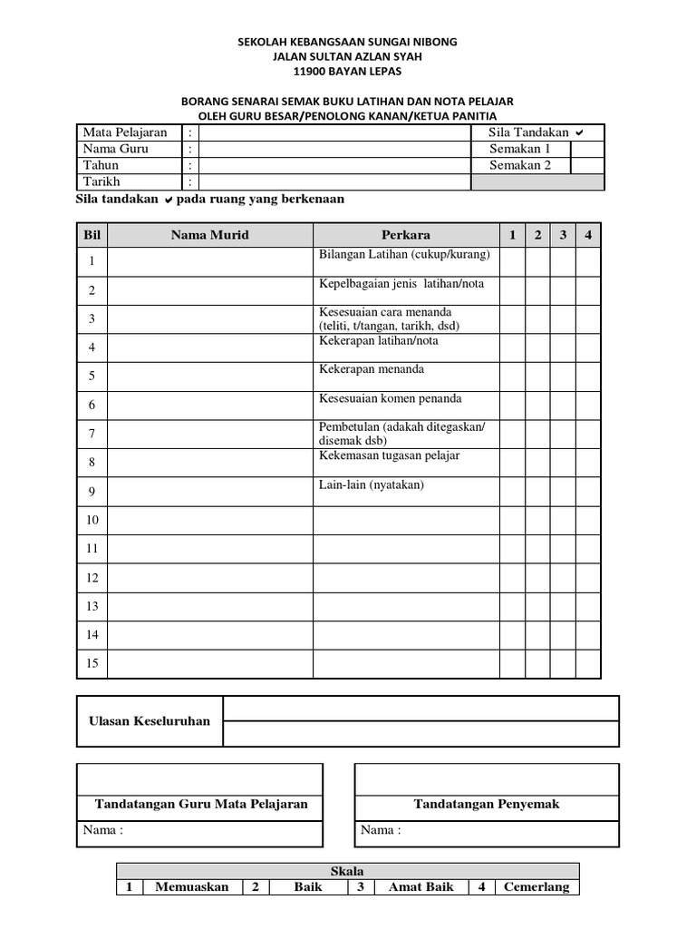 Berikut merupakan bahan berkaitan dengan penyemakan buku latihan murid. Sains bilangan buku latihan bil nama murid catatan guru catatan pentadbir1 nur afika shahira binti aripin2 aimi ayuni binti kamil muhammad izzul bin liasim 3 mohamad kassim4 umi najian binti karim5 fazrullah bin ibrahim6. Pk06 pengurusan semakan hasil kerja murid pengetua penolong penolong kanan guru yang diberi tanggungjawab untuk melaksanakan pencerapan. Rekod penyemakan buku latihan spsk pk06 01.