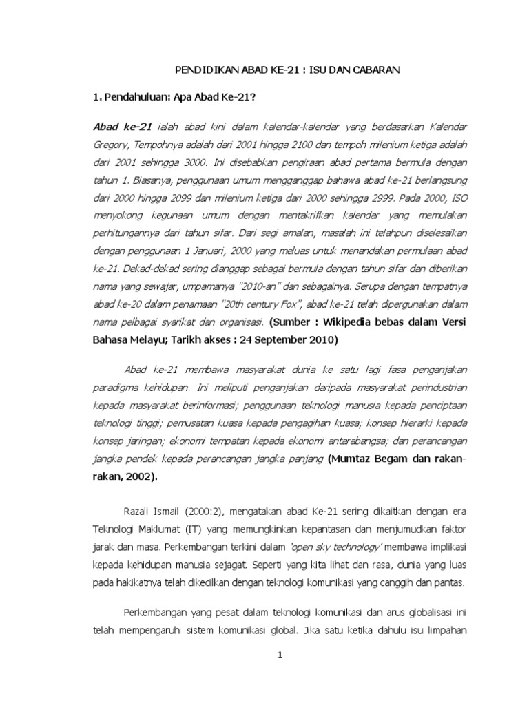 Cabaran pendidikan abad ke 21. Maka guru dan pelajar pada abad ke 21 ini haruslah sedar bahawa pendidikan kini tidak lagi tertumpu kepada kemahiran menghafal semata mata. Abad ke 21 ialah abad kini dalam kalendar kalendar yang berdasarkan kalendar gregory tempohnya adalah dari 2001 hingga 2100 dan tempoh milenium ketiga adalah dari 2001 sehingga 3000. Keperluan pendidikan di abad ke 21 ini memerlukan satu lonjakan dan paradigma baharu kerana kepelbagaian budaya dan kerencaman cabaran yang perlu dihadapi. 1 pendidikan abad ke 21.