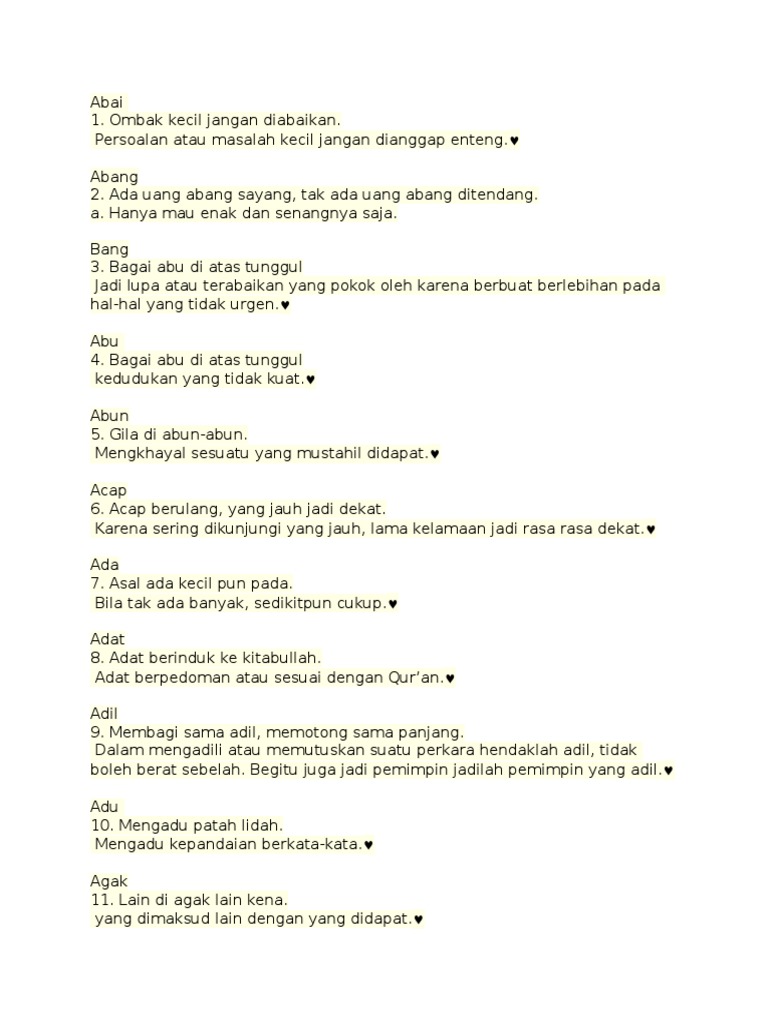 Dari semak ke belukar meninggalkan suatu yang buruk akan mendapat ganjaran yang buruk. Naga ditelan ular lidi orang bangsawan berkahwin dengan orang biasa. Perkara yang sudah selesai barulah terdengar rungutan atau keterangan. Orang yang kecil kecil hendak menjadi orang yang besar besar.