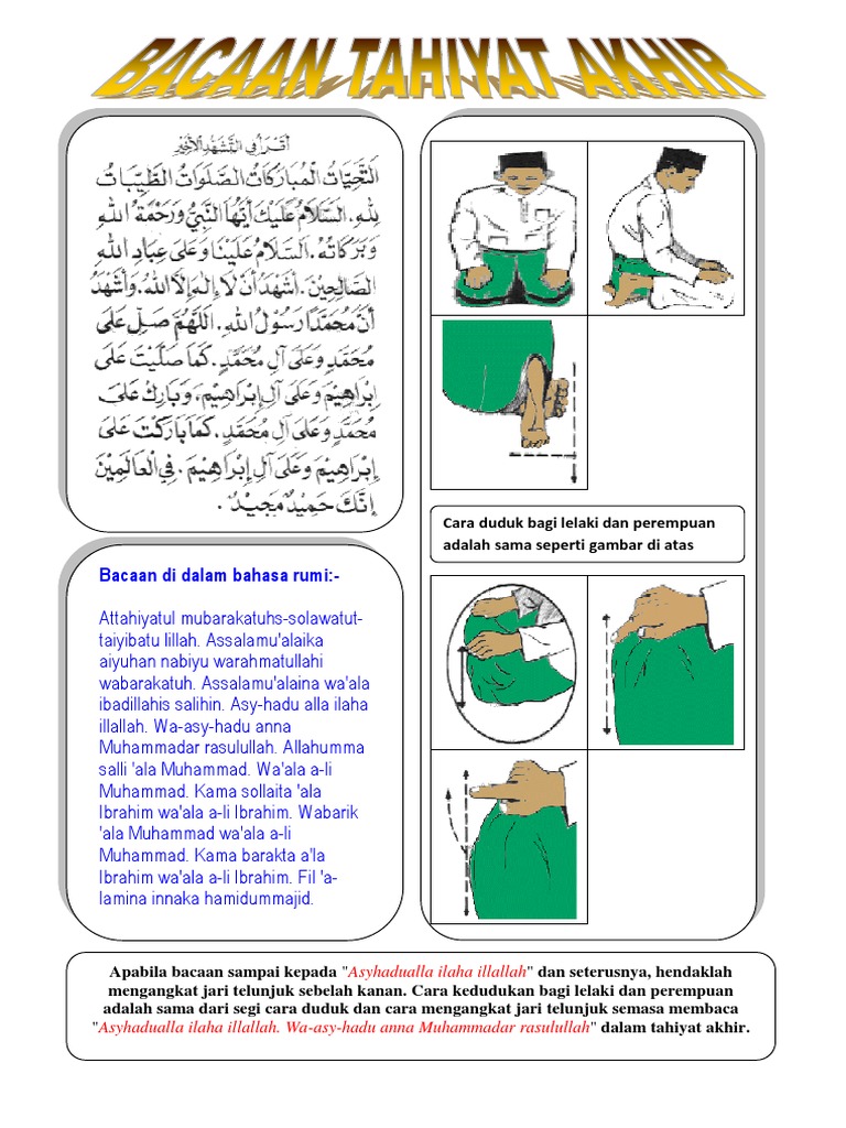 Oleh itu lafazkan bacaan ini dengan makhraj dan tajwid yang betul. Duduk tawarruk bersimpuh pada waktu duduk tasyahud akhir tahiyat akhir sunat hai at membaca selawat atas keluarga nabi saw pada tasyahhud akhir sunat ab adl. Wa asy hadu anna muhammadar rasulullah dalam tahiyat awal. Cara kedudukan bagi lelaki dan perempuan adalah sama dari segi cara duduk dan cara mengangkat jari telunjuk semasa membaca asyhadualla ilaha illallah.