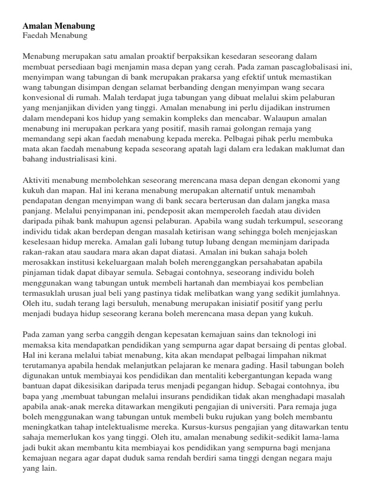 Cara memupuk amalan menabung karangan spm. Unknown 25 july 2020 at 07 40. Dengan cara ini amalan menabung secara tidak langsung mudah berakar umbi dalam hati anak anak. Di samping itu kemaslahatan diri dan keluarga akan terpelihara melalui amalan menabung. Semoga perkongsian bahan bahan rujukan panduan bahan pembelajaran dan pengajaran contoh contoh karangan sumber rujukan spm sijil pelajaran malaysia tingkatan 4 tingkatan 5 dalam post di blog bumi gemilang berguna dan dapat membantu para pelajar dan pengguna.