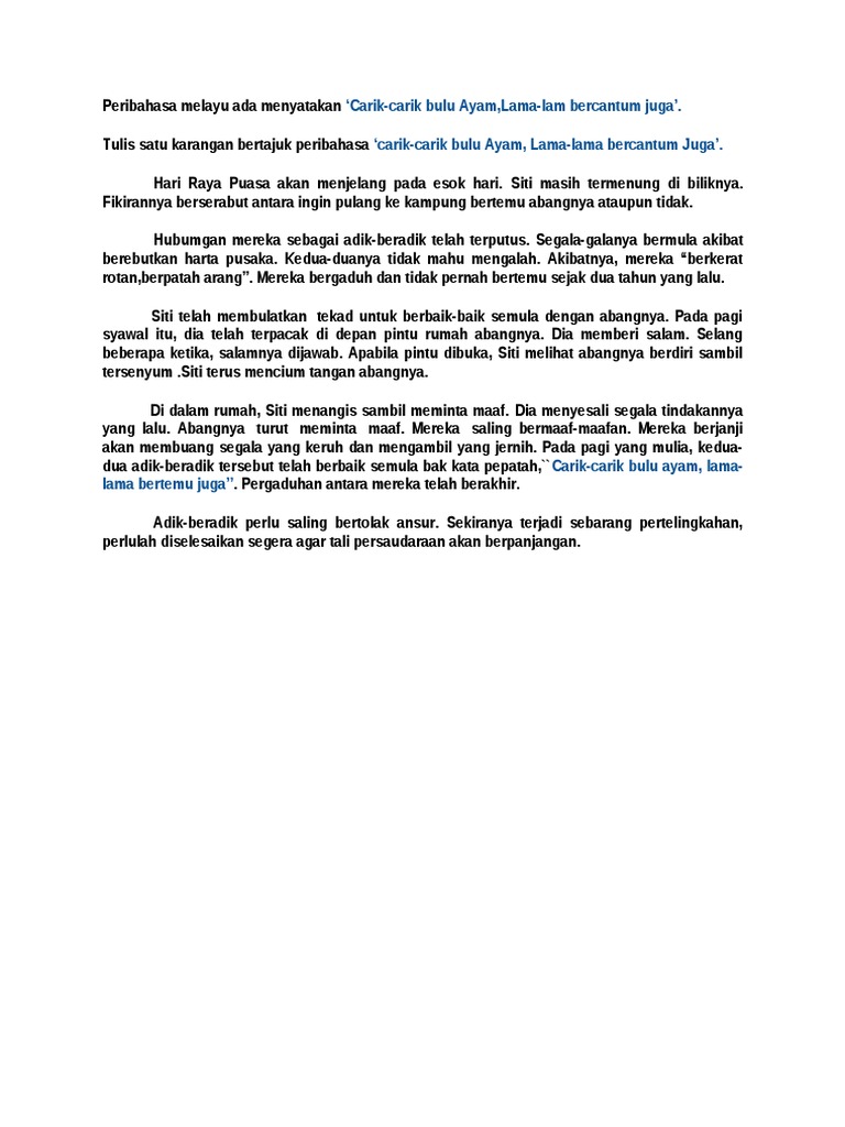 Hari raya puasa akan menjelang pada esok hari. Maksud peribahasa carik carik bulu ayam lama lama bercantum juga. Pergaduhan sesama keluarga tidak berpanjangan akhirnya berbaik baik semula. Apa itu carik carik bulu ayam lama lama bercantum juga.