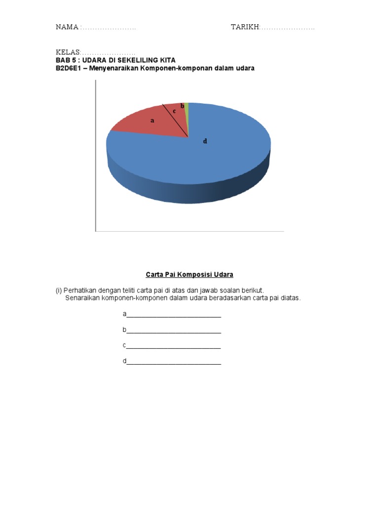 Bpeanbg7e nualdaanrakepada penyiasatan saintifik mari kita jalankan aktiviti 7 1 untuk menentukan peratusan oksigen dalam udara. Lakarkan carta pai yang menunjukkan kandungan semua komposisi udara yang terdapat dalam atmosfera bumi. Menentukan peratusan oksigen dalam udara bahan dan radas. Pencemaran udara primer ialah penghasilan sulfur monoksida dan karbon monoksida akibat daripada pembakaran yang tidak lengkap.