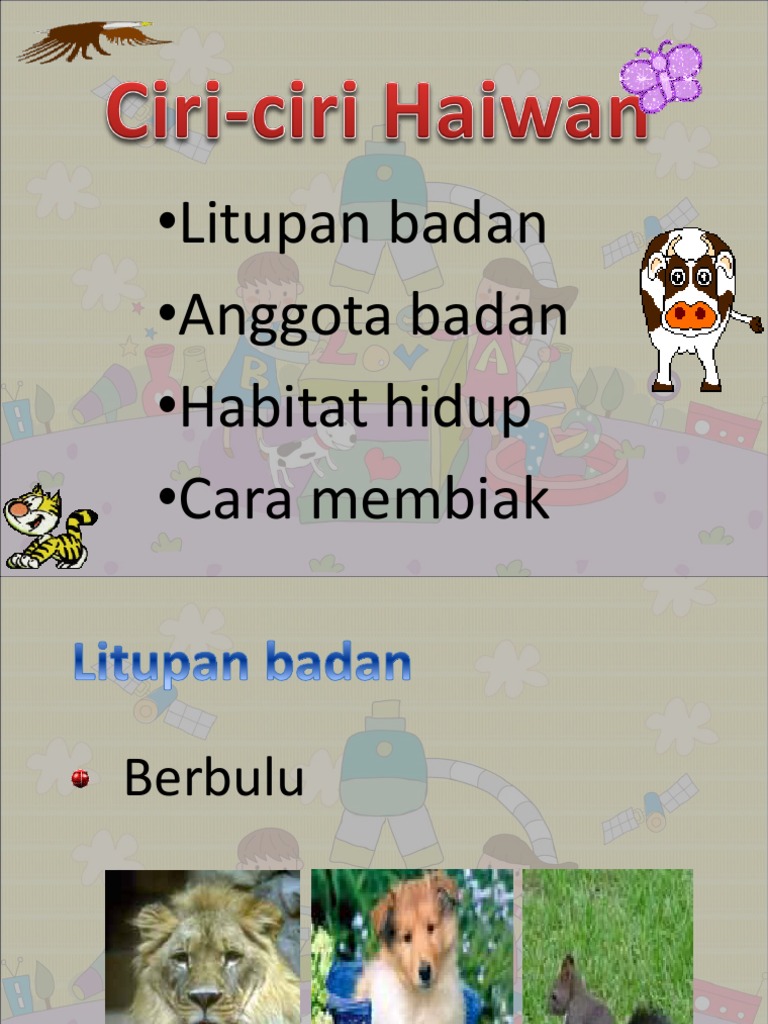 Sesuatu haiwan itu mempunyai ciri ciri khas yang tertentu bagi tujuan menyelamatkan diri daripada ancaman musuh. Cuba perhatikan ciri ciri yang terdapat pada buah. Haiwan mempunyai pelbagai bentuk anggota badan seperti berekor berbelalai berkepak berkaki tidak berka. Dengan mengenalpasti ciri dan mengenal habitat.