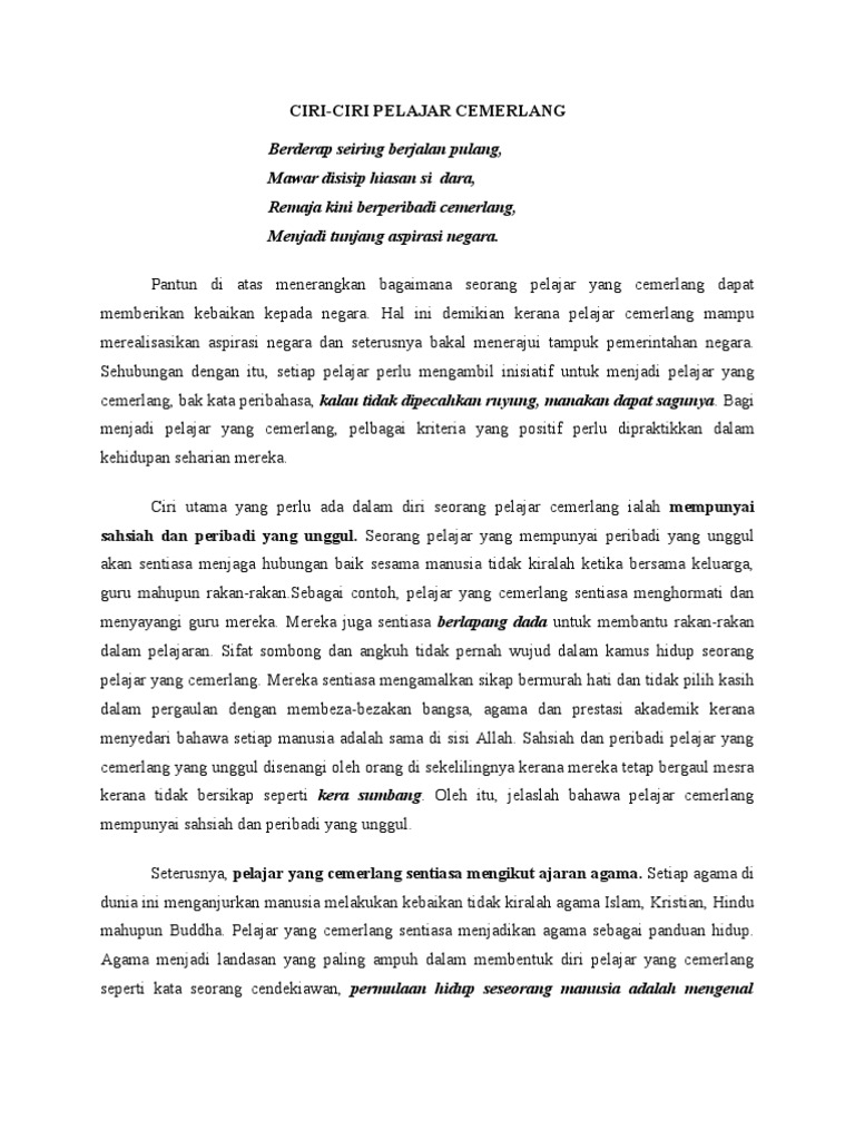 Ciri ciri murid cemerlang karangan pendek. Seorang pelajar yang mempunyai peribadi yang unggul akan sentiasa menjaga hubungan baik sesama manusia tidak kiralah ketika bersama keluarga guru mahupun rakan rakan sebagai contoh pelajar yang cemerlang sentiasa menghormati dan menyayangi guru mereka. Contoh karangan ciri ciri pekerja cemerlang. Namun impian ini tidak datang dengan sendiri. Karangan bahasa melayu pmr ciri ciri murid cemer.