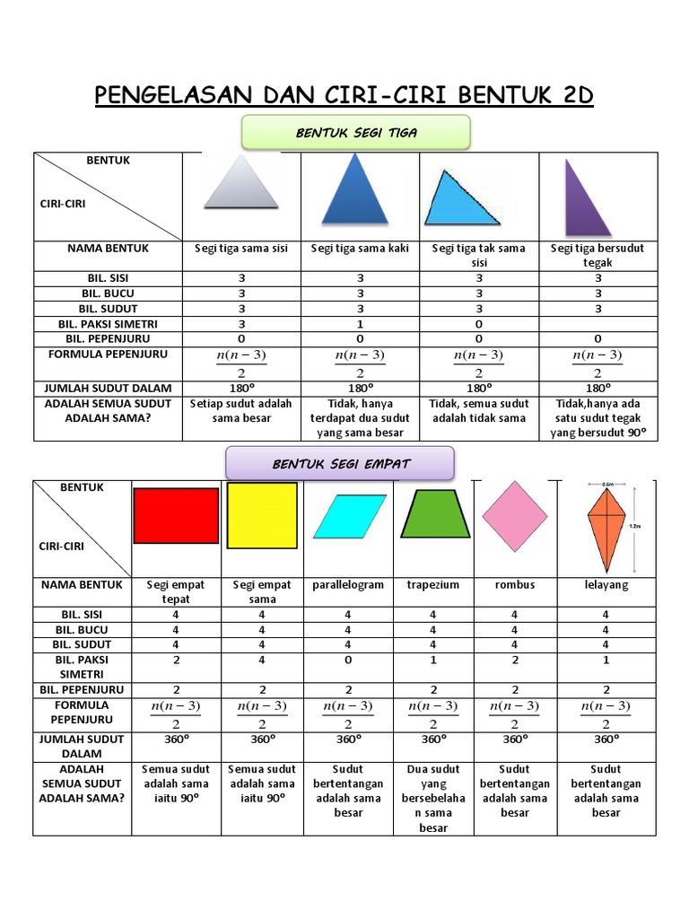 Segi tiga ialah satu poligon yang terdiri daripada tiga sisi yang berupa garis lurus dan tiga sudut ahli matematik euclid yang hidup sekitar tahun 300 sm menemukan bahawa jumlah ketiga tiga sudut dalam suatu segi tiga ialah 180 darjah apabila diketahui dua sudut dalam segi tiga maka dengan mudahnya akan dikenal pasti sudut yang terakhir. Ciri ciri limas segi empat. Memiliki 5 sisi terdiri atas 4 sisi tegak berbentuk segitiga dan 1 sisi alas berbentuk segi empat. Bahagian terakhir ini dipanggil asas.