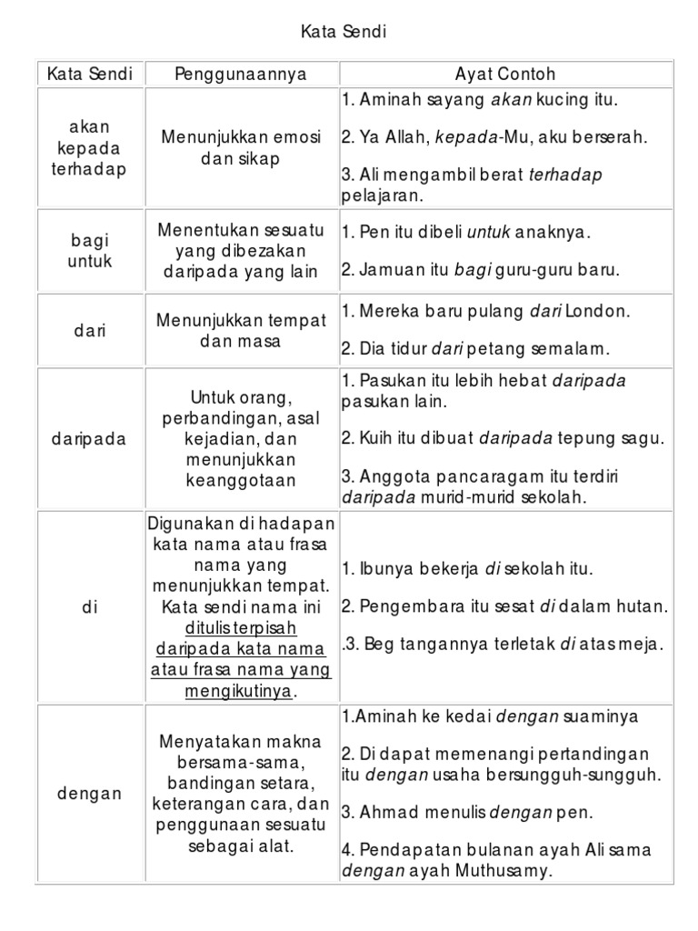 Contoh ayat diberikan agar pelajar lebih jelas penggunaannya. Kata sendi nama akan diuji pada soalan 3 d iaitu mengesan kesalahan tatabahasa atau di 3 b menentukan pola ayat frasa nama frasa sendi nama 1.