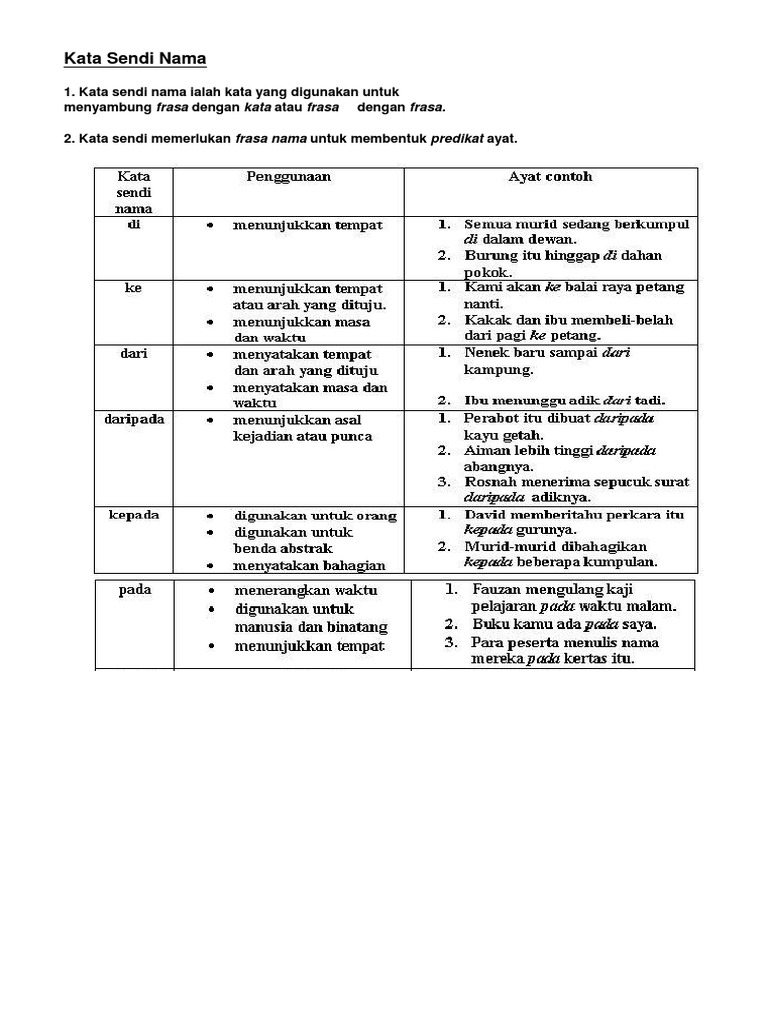 Contoh ayat kata sendi nama tahun 3. Kami sungguh benci akan kelakuannya yang buruk itu. 3 dari 从 时间 从 地方 bapa bekerja dari pagi hingga petang. 252 kata sendi nama ialah perkataan yang letaknya di hadapan frasa nama. Ditulis terpisah daripada kata nama atau frasa nama yang mengikutinya.