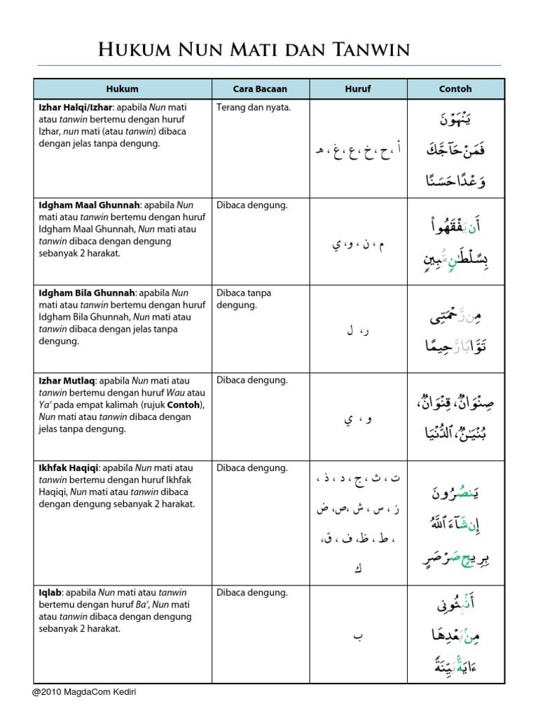 Macam macam hukum ilmu tajwid a. Tajwid hukum nun mati dan tanwin lengkap dan disertai pengertian gambar dan dengan contoh idzhar idghom iqlab dan ikhfa. Para ulama menyatakan bahwa hukum bagi mempelajari tajwid itu adalah fardhu kifayah tetapi mengamalkan tajwid ketika membaca al quran adalah fardhu ain atau wajib kepada lelaki dan perempuan yang mukallaf atau dewasa. Hal ini dikarenakan dengan kedudukan nun sukun atau mati atau harakat tanwin ini sangatlah berperan dalam menentukan hukum dan bunyi bacaan al qur an.