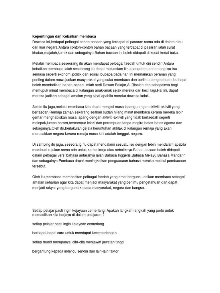 Membaca umpama kita sedang berinteraksi atau berdialog dengan seseorang insan bijaksana melalui huruf dan angka yang disusun untuk menjadi fakta. Membaca ialah satu aktiviti yang mendatangkan pelbagai faedah kepada pembaca amalan membaca boleh didefinisikan sebagai satu aktiviti yang berfaedah iaitu membolehkan seseorang itu mengetahui isi kandungan sesebuah buku surat khabar dan lain lain lagi membaca membolehkan individu mengetahui dan mengenali perkara perkara yang berlaku di dunia ini sasterawan negara terkenal iaitu a samad said. Sesungguhnya banyak kebaikan atau faedah yang dapat diperoleh dengan membaca. Faedah membaca amalan membaca merupakan satu amalan yang mulia.