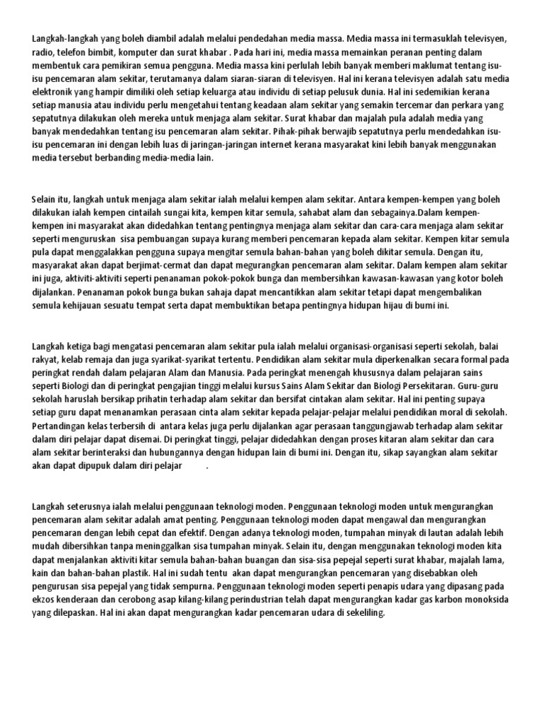 Pihak kerajaan dan badan badan bukan kerajaan yang berkaitan haruslah memainkan peranan penting dalam memulihkan dan memelihara alam sekitar. Oleh itu berikut adalah contoh karangan langkah langkah untuk menjaga alam sekitar sebagai panduan kepada pelajar. Alam sekitar masa kini semakin tercemar kerana terdapat pihak pihak yang tidak bertanggungjawab telah melakukan pencemaran seperti pembuangan sampah di sungai sungai penggunaan baja baja. Alam sekitar ini termasuklah kawasan kawasan tumbuhan hijau udara dan air seperti sungai dan laut.