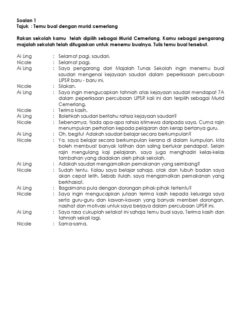 Blog ini dibina bagi mengumpul contoh contoh karangan bahasa melayu yang sesuai untuk pelajar sekolah rendah. Tahunalamat pada 5 mei 2013 yang lalu saya telah pergi ke rumah slideshare uses cookies to improve functionality and performance and to provide you with relevant advertising. Nama watak ditulis selari di sebelah kiri. Tujuan temu ramah ini diadakan adalah untuk mengetahui lebih mendalam mengenai penglibatan kejayaan dan perancangan pada masa hadapan beliau dalam bidang sukan yang diceburuinya tulis temu ramah itu selengkapnya.