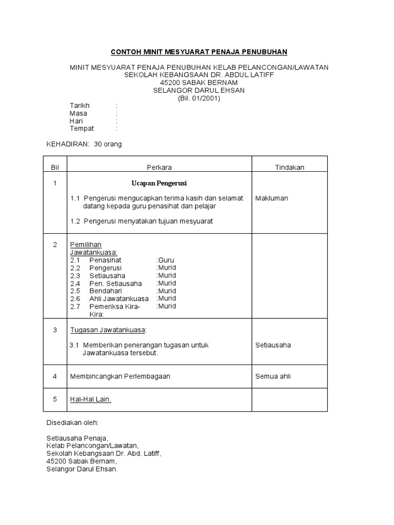 Contoh minit mesyuarat penaja untuk persatuan kelab. 9 00pm 10 30 pm tempat. Minit mesyuarat agung unit beruniform. Pendaftaran bagi persatuan ini akan diuruskan oleh jawatankuasa penaja.