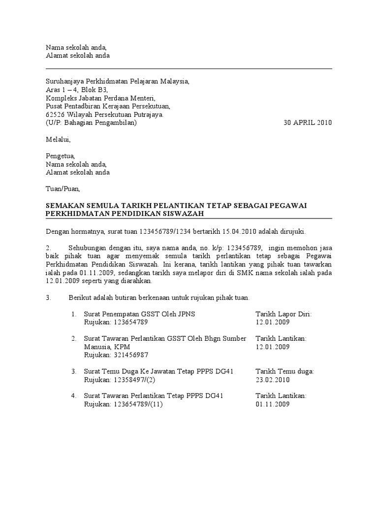 Contoh surat lantikan jawatan tetap. Apabila majikan mula mengaji pekerja surat lantikan akan dibuat untuk membuat pengambilan pekerja secara rasmi. Contoh surat rasmi lantikan jawatan. Setiap surat tawaran pekerjaan yang disediakan akan merangkumi info mengenai gaji dan faedah serta bonus. Manakala pengesahan jawatan atau pelantikan adalah satu proses pengesahan lantikan seseorang pekerja job confirmation yang bersetuju untuk menerima tawaran pekerjaan ke jawatan tetap dan telah memenuhi syarat syarat tawaran pekerjaan.
