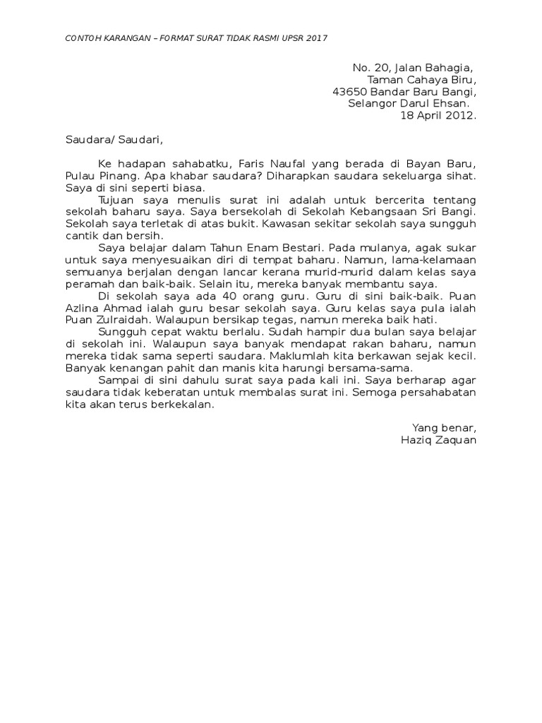 Contoh surat tidak rasmi bahasa inggeris upsr. Contoh surat tidak resmi bahasa inggris contoh surat tidak rasmi contoh surat tidak rasmi spm contoh surat tidak rasmi kerajaan contoh surat tidak rasmi tahun 4 contoh surat tidak resmi contoh surat tidak hadir sekolah. Contoh surat kiriman tidak rasmi soalan 1. Surat kiriman tidak rasmi adalah karangan berformat dan sering dikeluar sebagai soalan di peperikasaan upsr pt3 spm ataupun stpm. Berikut adalah beberapa ungkapan lazim yang berguna apabila menulis surat dan e mel dalam bahasa inggeris.