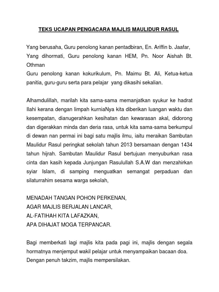 Contoh teks ucapan pengerusi majlis sambutan maulidur rasul. Contoh teks pengacara majlis sambutan maulidur rasul dan majlis perpisahan tanpa nama 9 mac 2013 9 29 ptg. Contoh teks terbaik dan lengkap dari mula program sehingga akhir penutup. Pengetua untuk menyampaikan ucapan sekaligus merasmikan majlis sambutan maulidur rasul peringkat sekolah pada hari ini. Juga sesuai diubahsuai untuk program sambutan lain dan juga peringkat daerah serta kebangsaan.