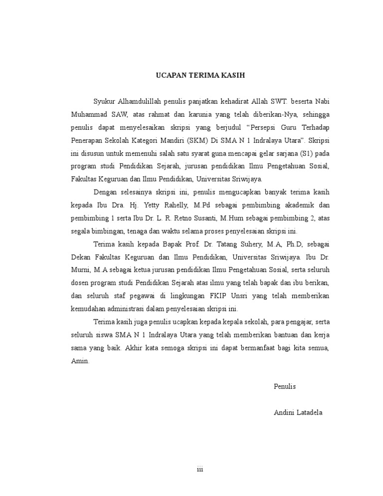 Allah swt atas rahman dan rahiim nya serta nabi muhammad saw yang telah membawa umat manusia ke zaman yang penuh akan cahaya ilmu. Contoh kata pengantar skripsi. Berikut ini kami contohkan satu contoh ucapan terima kasih dalam penulisan skripsi anda dapat mengubahnya sesuai dengan kebutuhan anda sendiri. Dan ibu hasriyanty s p m si selaku dosen pembimbing disela sela rutinitasnya namun tetap meluangkan waktunya untuk memberikan petunjuk dorongan saran dan arahan sejak rencana penelitian hingga selesainya penulisan skripsi ini.