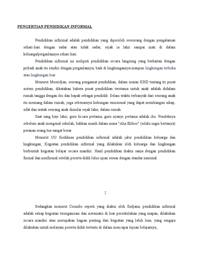 Pendidikan lebih ditekankan kepada keperluan kehidupan semasa dan berkembang kepada pendidikan islam sebagai asas kehidupan. Pendididikan tidak formal merupakan pendidikan awal yang diterima oleh kanak kanak melalui institusi kekeluargaan. Pendidikan non formal banyak jenis pendidikan non formal terlihat di masyarakat saat ini tentu saja ini wajar mengingat usia saya saat ini semakin meningkat dan tidak akan berkurang. Pendidikan formal juga telah mentransformasikan saya daripada.