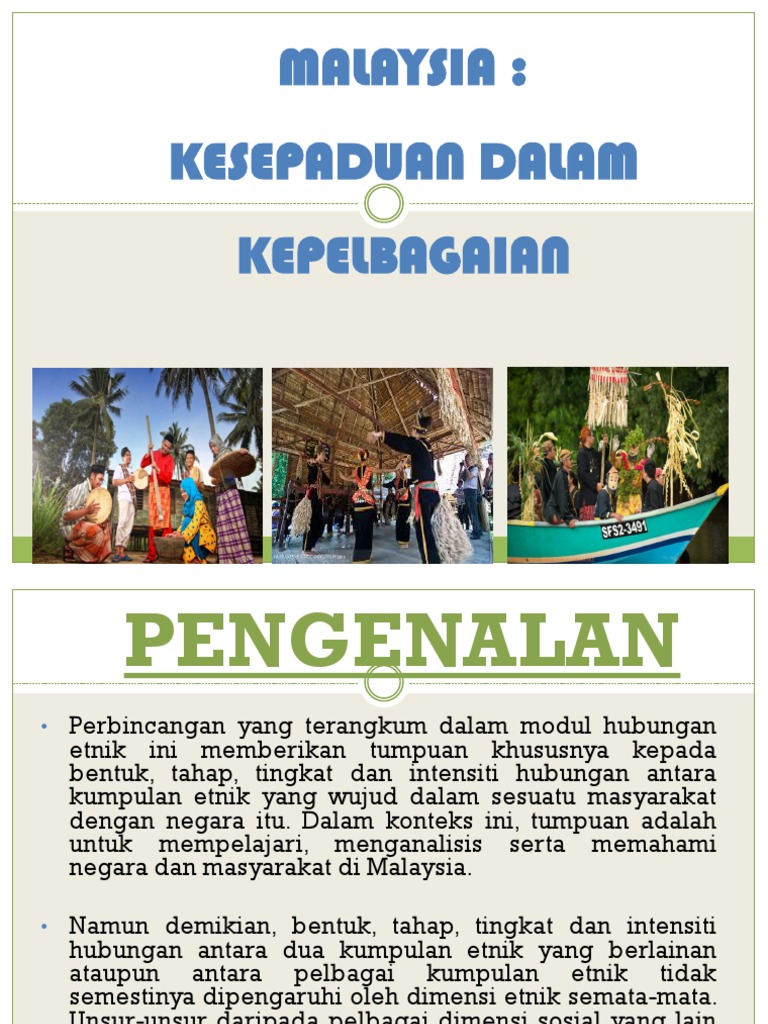 Pengetahuan dan kefahaman antara satu sama lain membolehkan kerjasama padu antara mereka untuk berganding bahu membawa kemajuan kepada negara malaysia. Konsep perpaduan dalam kepelbagaian adalah penting dalam konteks malaysia yang lebih. Perpaduan sosial membawa maksud yang pelbagai dan berbeza mengikut konteks perbincangan atkinson. Dalam konteks antropologi dan sosiologi kajian terhadap etnik berbeza merupakan suatu yang penting bagi mewujudkan perhubungan baik dan harmonis di kalangan pelbagai etnik.