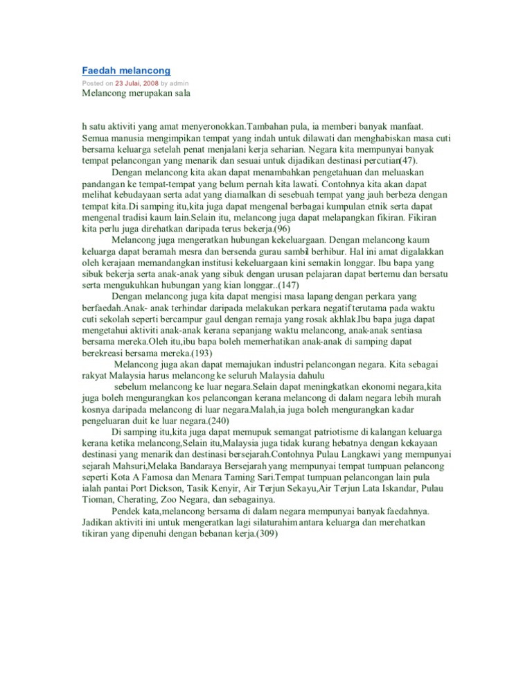 Membantu menjana ekonomi negara b. Malahan pilihlah negara apa yang ingin dilawati yang sesuai dengan bentuk kepuasan yang ingin dicari agar lawatan kita itu mendatangkan 1001 kebaikan dalam diri masing masing. Selain itu melancong dalam negara juga dapat merapatkan hubungan kekeluargaan antara anggota keluarga terutamanya mereka yang jauh di mata tetapi dekat di hati. Sedar atau tidak apabila kita melancong dalam negara kita sebenarnya berpeluang untuk mengenali dengan lebih dekat akan destinasi pelancongan kebudayaan dan warisan negara kita.