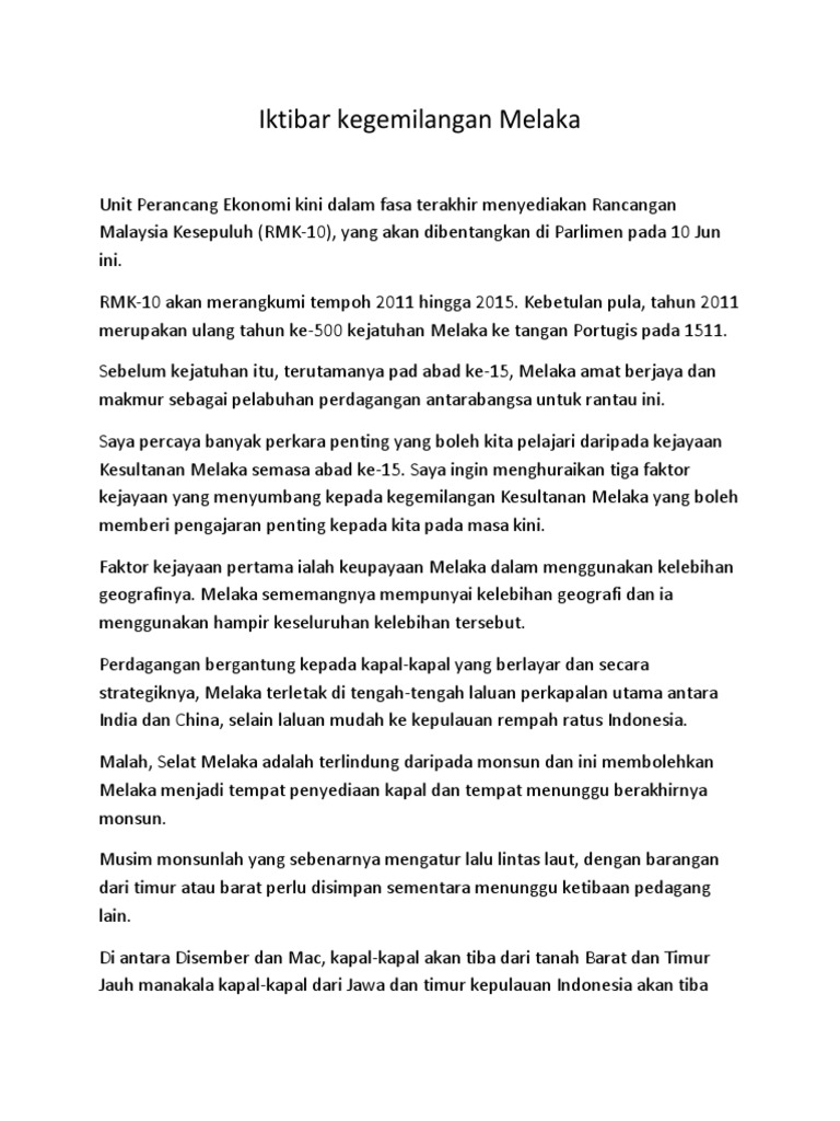 Peradaban dan peraturan kenegaraan kerajaan ini tercatat dalam seajrah melayu atau sulalatus salatin karangan tun seri lanang yang merupakan dokumen historiografi melayu terpenting. Kerajaan melayu melaka menguasai sepenuhnya selat melaka yang menjadi laluan perdagangan dunia terpenting. Memberi 5 iktibar yang diperolehi dari kegemilangan melaka helo kawan soalan dan jawapan belajar tentang perkongsian pengajaran kali ini bertajuk memberi 5 iktibar yang diperolehi dari kegemilangan melaka dalam membantu untuk menjawab soalan atau membantu pembelajaran ye mudah mudahan kandungan posting soalan dan jawapan yang saya kongsi ini anda boleh faham jika terdapat sebarang. Kewujudan melaka sebagai entiti politik dan kerajaan membawa makna sejarah yang besar dalam sejarah pembentukan malaysia sehingga sekiranya mengkaji susur galur pembentukan negara ini ia wajib bermula dengan penubuhan empayar kesultanan melayu melaka.