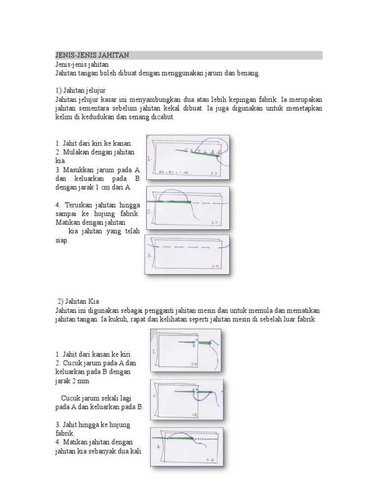 Buletin teknis ini dapat menjadi panduan kilat bagi anda mengenai jenis jenis jahitan. Mulakan jahitan dengan jahitan kia dari kiri ke kanan. Jahitan ini boleh digunakan sebagai pengganti jahitan mesin. Ia merupakan jahitan sementara sebelum jahitan kekal dibuat.