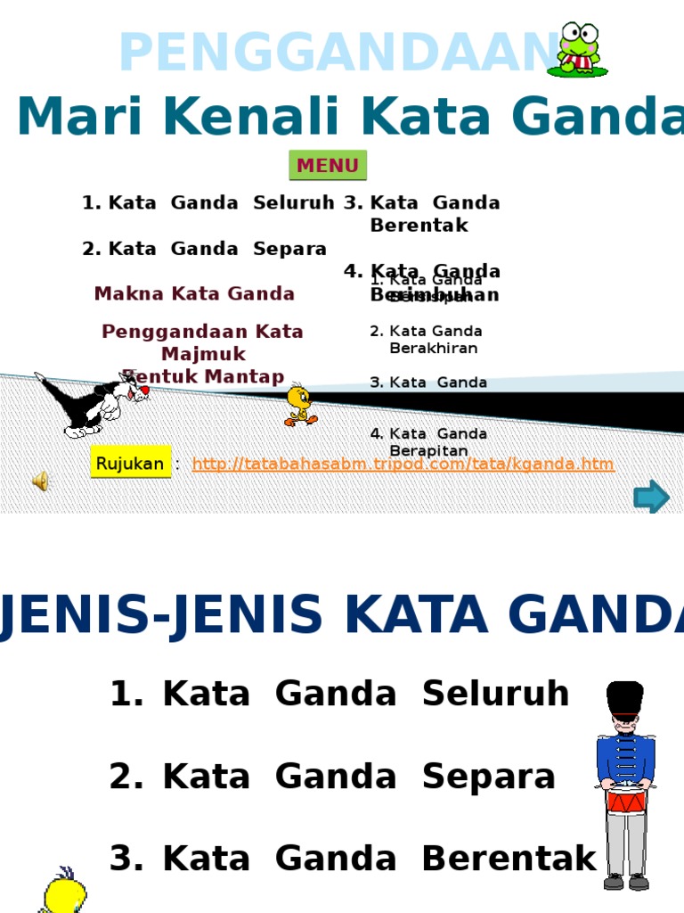 We use your linkedin profile and activity data to personalize ads and to show you more relevant ads. Kata ganda bersajak atau berima ialah kata ganda yang mengalami persamaan atau penyesuaian bunyi rima di pangkal di hujung atau seluruhnya apabila digandakan. Gandaan berlaku pada seluruh perkataan tersebut tanpa ada perubahan.