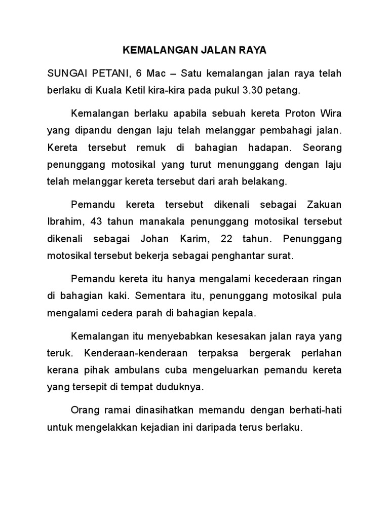 Karangan berita kemalangan jalan raya tahun 6. Kuala lumpur 8 april satu kemalangan jalan raya telah berlaku di jalan kuching kira kira pada pukul 3 30 petang. Dasawarsa ini isu kemalangan jalan raya yang semakin meruncing sering menjadi fokus perbincangan dan mauduk utama akhbar akhbar tempatan di malaysia. Contohnya dalam upsr 2008 terdapat ayat cara cara melintas jalan raya dengan selamat. Keadaan ini semakin merunsingkan apabila banyak kejadian yang melibatkan kemalangan jiwa berlaku.