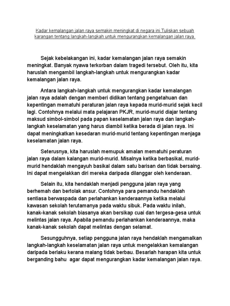 Dasawarsa ini isu kemalangan jalan raya yang semakin meruncing sering menjadi fokus perbincangan dan mauduk utama akhbar akhbar tempatan di malaysia. Karangan bahasa melayu bm stpm kemalangan jalan raya sijil tinggi persekolahan malaysia. Pada pagi yang ceria ini saya mewakilli kelas saya tahun 6 zamrud akan menyampaikan sebuah syarahan yang bertajuk cara cara menjaga keselamatan di jalan raya. Karangan esei bahasa malaysia bm stpm.