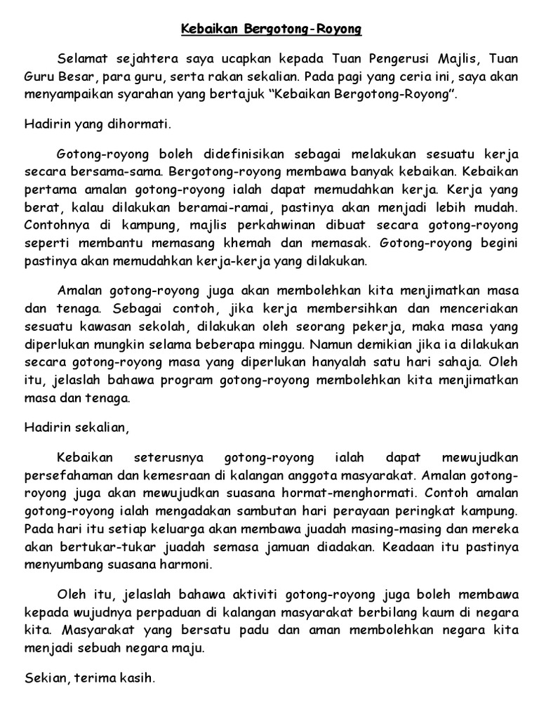 Kebaikan amalan gotong royong ujian lisan. Huraikan pendapat anda tentang faedah faedah amalan gotong royong. Senarai tajuk ujian lisan berasaskan sekolah ulbs bahasa melayu spm. Terdapat beberapa kebaikan amalan gotong royong jika diamalkan dalam kehidupan seharian. Ini sudah pasti meringankan beban kerja yang banyak untuk membersihkan kawasan sekolah tersebut.