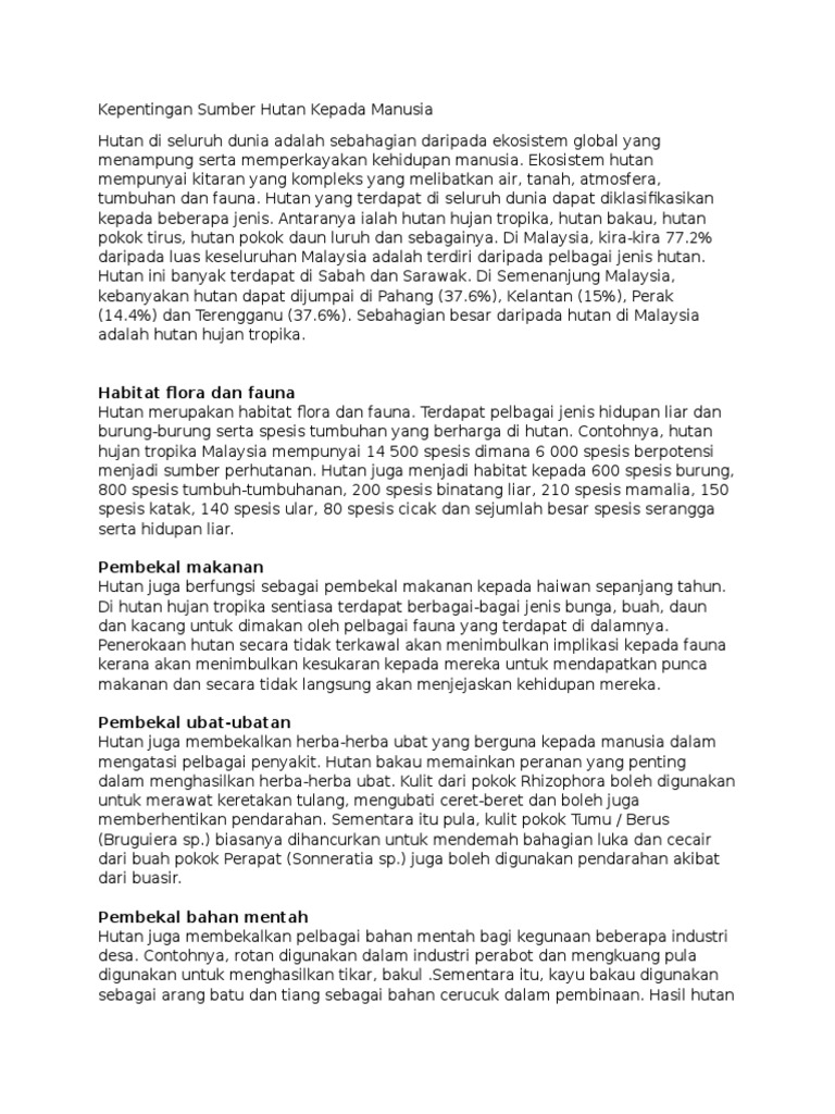 Kepentingan hutan kepada manusia geografi. Hutan telah meliputi keluasan muka bumi sebanyak lima puluh peratus. Hutan memberikan pelbagai kepentingan kepada manusia sejak kelahiran manusia terawal dalam alam semesta. Hutan dianggap sebagi sumber yang boleh diperbaharui benar tetapi untuk memperbaharuinya mengambil masa yang lama hutan yang sudah dimusnahkan oleh manusia atas dasar pembangunan sukar untuk pulih seperti sediakala dengan fungsinya sebagai biodiversiti menjadikan malaysia sebagi salah satu khazanah dunia yang kaya dengan pelbagai kehidupan biotik dan abiotik sesungguhnya hutan mempunyai. Geografi bab 15.