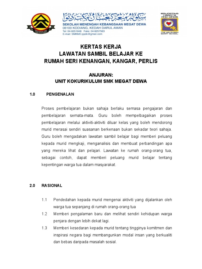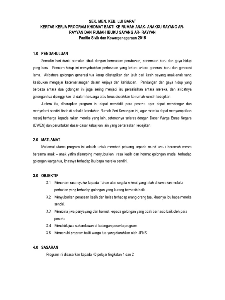 Ziarah an nur 14 hingga 16 mac 2014 1435h berat sama dipikul ringan sama di jinjing dengan nama allah yang maha pemurah lagi maha mengasihani ziarah an nur lawatan ke rumah badan usaha didikan anak yatim dibawah pertubuhan kebajikan anak yatim perlis 2014 1435h tarikh 14 hingga 16 mac 2014 jumaat hingga ahad tempat kompleks penyayang dr siti hasmah. Khidmat masyarakat ialah kerja kerja kemasyarakatan yang dilaksanakan secara berkumpulan dan mempunyai matlamat serta tujuan tertentu. Kertas kerja cadangan bagi program khidmat masyarakat di rumah anak anak yatim nurul ihsan sg siput 1 0 tujuan kertas kerja ini bertujuan untuk mendapatkan kelulusan seminar dan projek pelajar untuk menganjurkan program loving is caring bagi memenuhi syarat kerja kursus mata pelajaran khidmat masyarakat mpu 3412. Kertas kerja lawatan ke rumah orang tua.