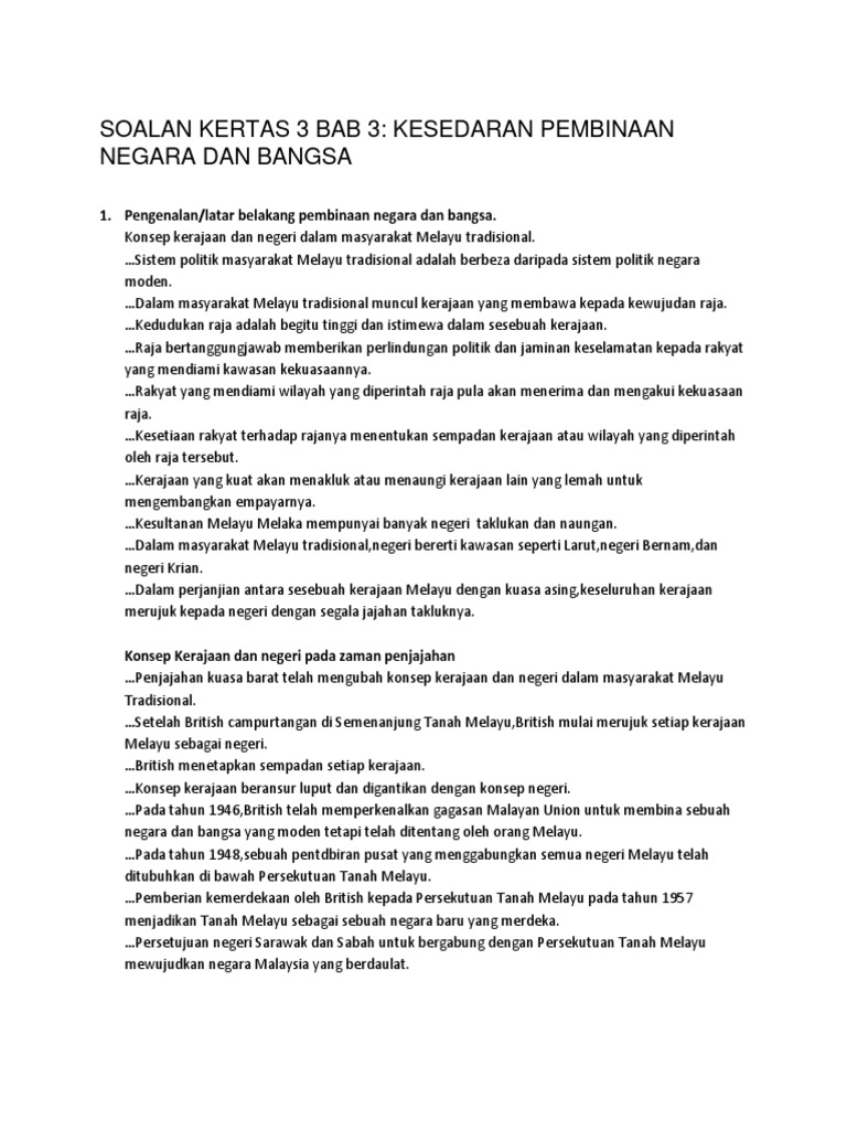 Soalan kertas 3 bab 3. Pelajar mengemukan jawapan dengan menjelaskan tentang sistem politik masyarakat melayu tradisional dan proses pembentukan negara dan bangsa malaysia. Pembinaan negara dan bangsa malaysia huraian sukatan pelajaran dan buku teks sejarah tingkatan 5 bab 4. Contoh soalan cadangan jawapan pembinaan negara dan bangsa malaysia.