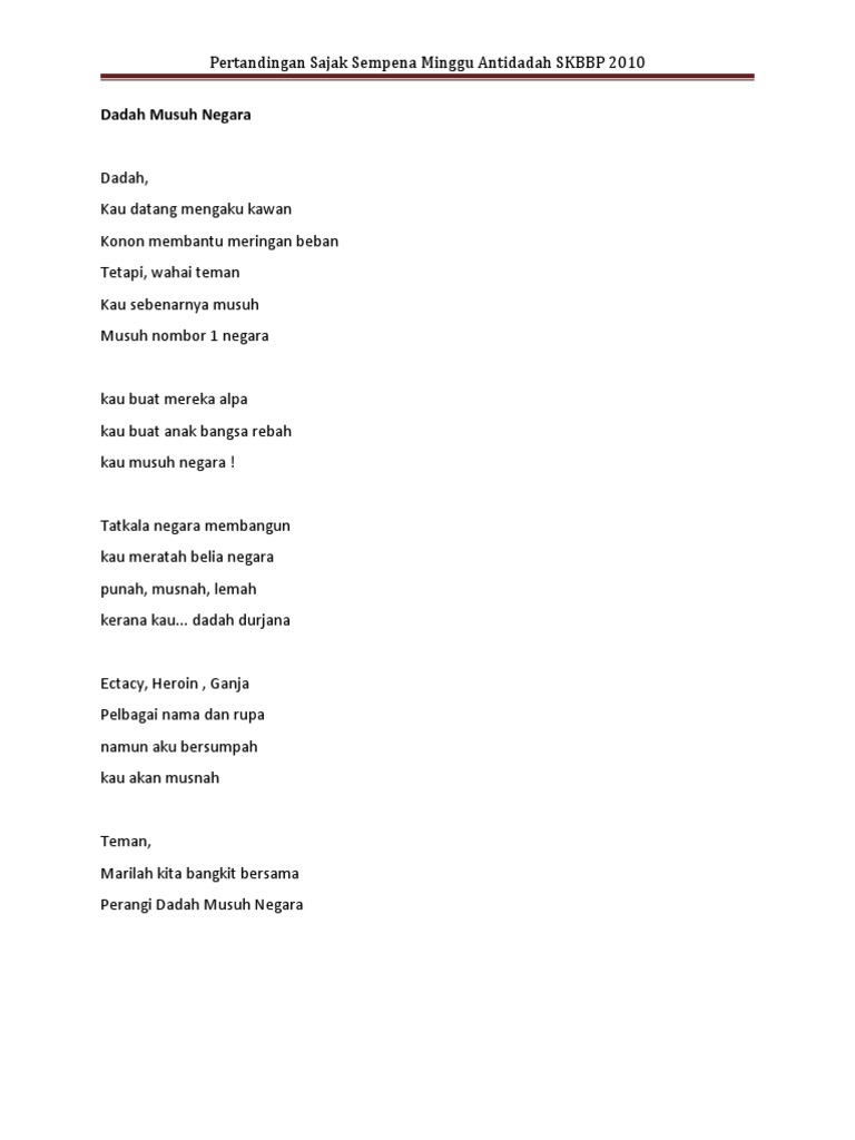 Sajak sendiri termasuk ke dalam puisi melayu. Just me 15 july 2013 at 20 29. Tapi negara ini akan lebih merdeka jika tiada penagih dadah musuh yang lesu menyerang dalam senyap. Asal kata pantun dari sanskrit yang bermaksud bicara aturan yang sah.