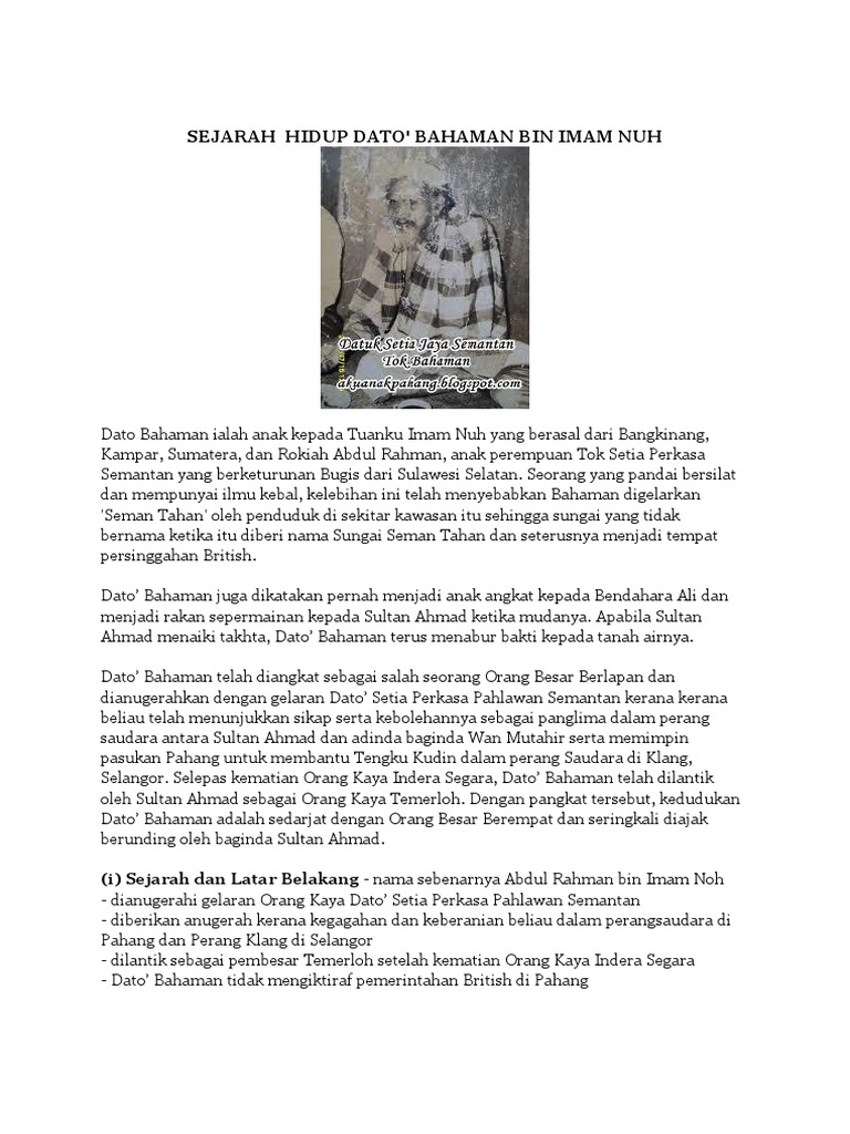 Latar belakang dato bahaman di pahang. He is the great granduncle of abu samah mohd kassim whom was also a famous fighter later became a central committee member of the malayan communist party and nationalist in the malayan national liberation army. Beliau merupakan seorang orang besar raja seorang lelaki yang mentadbir tanah yang diberikan kepadanya oleh sultan dan salah seorang pembesar di istana di negeri pahang. Beliau berasal dari suku kaum bugis. Dato bahaman telah diangkat sebagai salah seorang orang besar berlapan dan dianugerahkan dengan gelaran dato setia perkasa pahlawan semantan kerana kerana beliau telah menunjukkan sikap serta kebolehannya sebagai panglima dalam perang saudara antara sultan ahmad dan adinda baginda wan mutahir serta memimpin pasukan pahang untuk membantu tengku kudin dalam perang saudara di klang selangor.