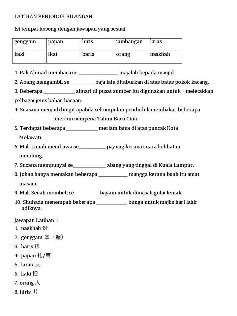 Bahasa melayu tahun 6 penjodoh bilangan 1. Penjodohbilangan ialahperkataan yang digunakan bersama sama kata bilangan. Latihan penjodoh bilangan 2 penjodoh bilangan. Pilih jawapan yang paling sesuai untuk mengisi tempat kosong.