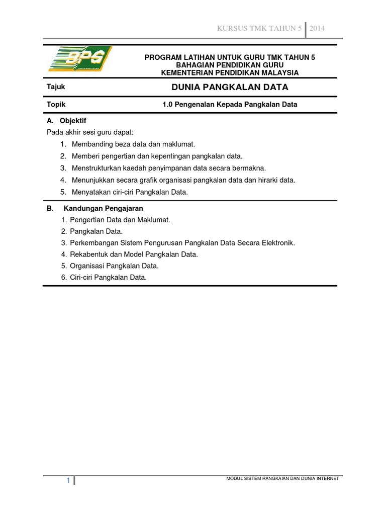 Kursus tmk tahun 5 2014 1 modul sistem rangkaian dan dunia internet program latihan untuk guru tmk tahun 5 bahagian pendidikan guru kementerian pendidikan malaysia tajuk dunia pangkalan data topik 1 0 pengenalan pangkalan data a.
