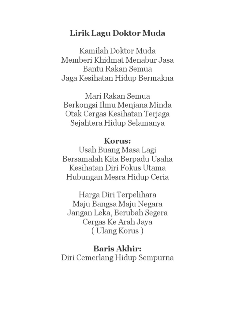 Lirik lagu doktor muda kamilah doktor muda memberikhidmat menabur jasa bantu rakan semua jaga kesihatan hidup bermakna mari rakan semua berkongsi ilmu menjana minda otak cergas kesihatan terjaga sejahtera hidup selamanya korus.