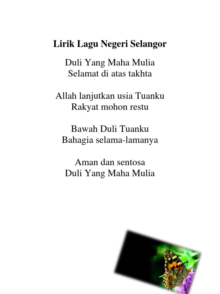Lagu kebesaran negeri atau lagu selamat sultan yang digunakan hingga masa kini digubah dalam tahun 1927 semasa pemerintahan almarhum sultan sulaiman badrul alam shah. Lirik lagu 2020 lirik lagu dan video klip. Selamat sultan jawi سلامت سلطان it was composed by mohamad hashim bin abu bakar in 1927 an assistant teacher at the malay primary school at paya bunga he also wrote the lyrics. Lirik lagu 2020 lirik lagu dan video klip.