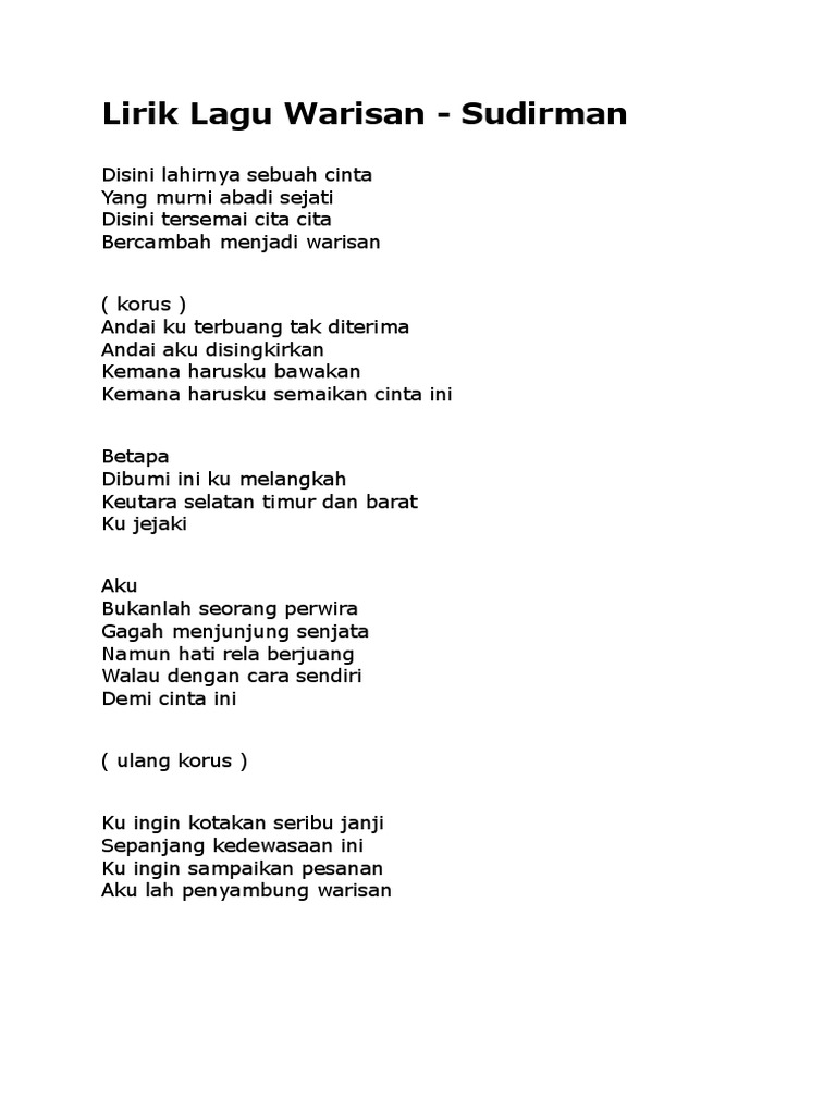 Berikut ini yang mungkin masih berkaitan dengan. Lirik lagu merisik khabar sudirman hj arshad erkapar kapar ku kelemasan sakit dilambung ombak kerinduan di dalam tidur di dalam jaga diburu oleh mimpi yang serupa mengapa aku jadi tidak menentu kerana mu. Lirik lagu warisan sudirman hj arshad disini lahirnya sebuah cinta yang murni abadi sejati disini tersemai cita cita bercambah menjadi warisan korus andai ku terbuang tak diterima andai aku disingkirkan kemana harusku bawakan kemana harusku semaikan cinta ini. Lagu warisan merupakan sebuah lagu yang telah dipopularkan oleh sudirman haji arshad.