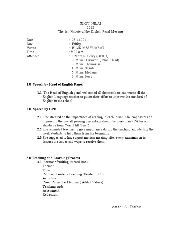 Minit translation in malay english dictionary. Minit mesyuarat ialah satu hal atau perkara yang telah dibincangkan dalam sesuatu mesyuarat dan persetujuan telah dicapai terhadap perbincangan tersebut ini bermakna catatan minit mesyuarat amat penting bagi membolehkan tindakan dapat dilaksanakan oleh pihak pihak yang terlibat dengan berkesan minit mesyuarat menjadi panduan perlaksanaan yang terlibat. What does mesyuarat diadakan mean in english. Doc minit mesyuarat panitia bahasa inggeris alis.