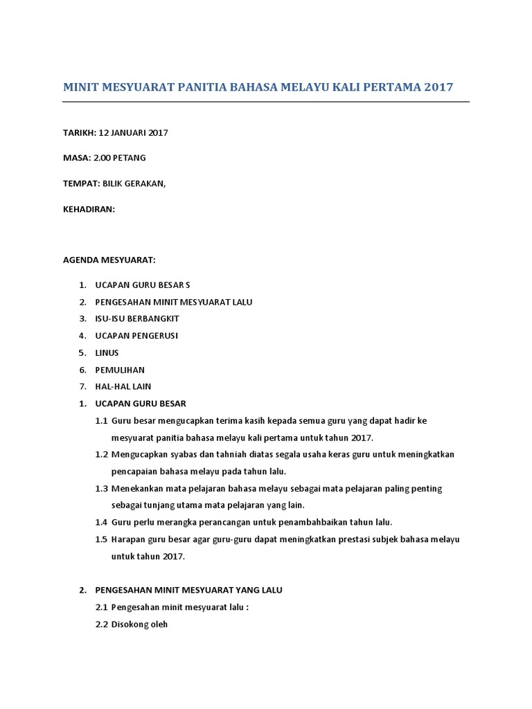 Minit mesyuarat panitia bahasa melayu kali pertama 2015. Pengesahan minit mesyuarat lalu 3. Minit mesyuarat ialah satu hal atau perkara yang telah dibincangkan dalam sesuatu mesyuarat dan persetujuan telah dicapai terhadap perbincangan tersebut ini bermakna catatan minit mesyuarat amat penting bagi membolehkan tindakan dapat dilaksanakan oleh pihak pihak yang terlibat dengan berkesan minit mesyuarat menjadi panduan perlaksanaan yang terlibat. 1 30 petang tempat.