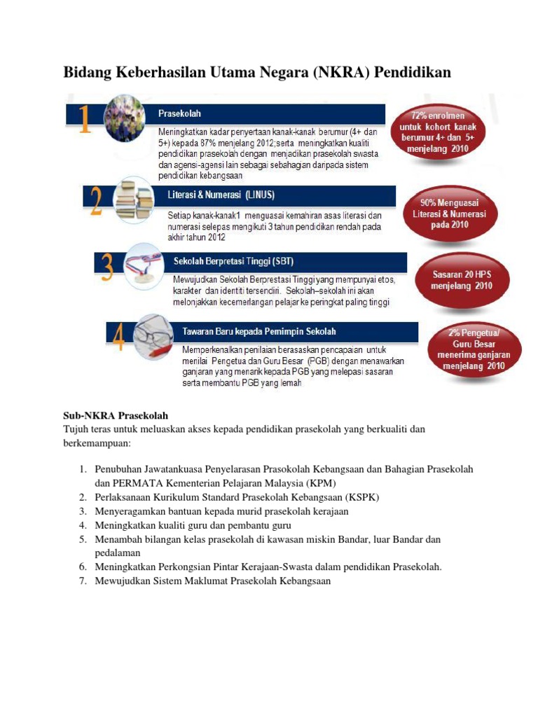 Bidang keberhasilan utama negara nkra ini membuktikan kerajaan di bawah pimpinan yb dato seri najib tun razak begitu telus dan komited untuk melaksanakan transformasi perkhidmatan kerajaan yang bermutu tinggi kepada rakyat. 6 bidang keberhasilan utama negara nkra pendidikan sub nkra prasekolah tujuh teras untuk meluaskan akses kepada pendidikan prasekolah yang berkualiti dan berkemampuan. 1 penubuhan jawatankuasa penyelarasan prasokolah kebangsaan dan bahagian prasekolah dan permata kementerian pelajaran. Bilakan perdana menteri dato seri najib tun razak mengumumkan 6 national key result area nkra.