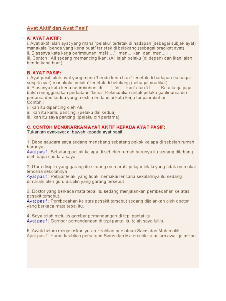 Ayat pasif ayat pasif ialah ayat yang menekankan mengutamakan objek dan perbuatannya. 1 bilik tidur itu mereka kemaskan x. Elakkan daripada membina ayat pasif diri ketiga sama seperti pembentukan ayat pasif diri pertama dan ayat pasif diri kedua dan sebaliknya. Ayat aktif ayat aktif ialah yang menekankan atau mengutamakan si pelaku pembuat sebagai subjek dan ayatnya mengandungi kata kerja yang berawalan men me mem men menge dan meny.